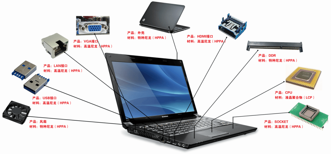高溫尼龍可取代金屬達到輕薄設(shè)計,可應(yīng)用在筆電外殼、平板外殼,優(yōu)異的耐高溫性和尺寸穩(wěn)定性使其在筆電的風(fēng)扇、接口廣泛應(yīng)用。